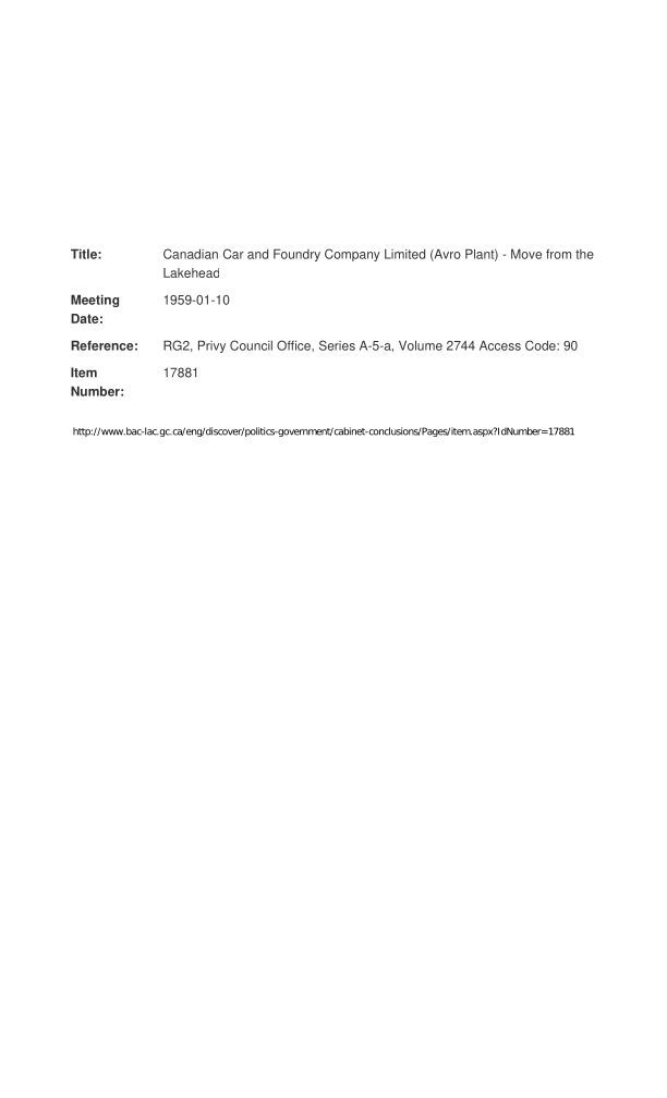 Canadian Car and Foundry Company Limited (Avro Plant) - Move from the LakeheadGeneral Notes