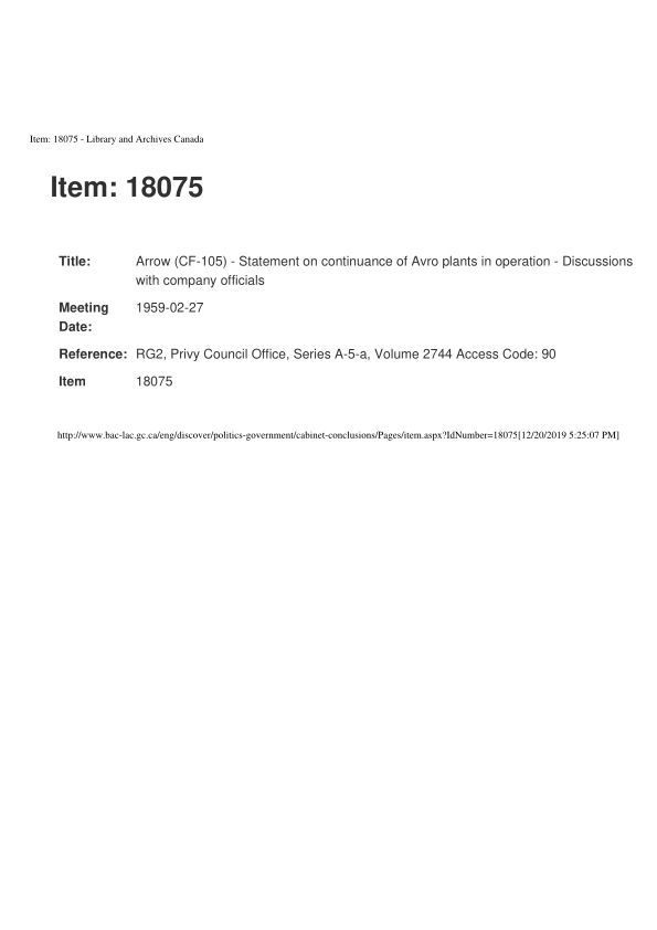 Arrow (CF-105) - Statement on continuance of Avro plants in operation - Discussions with company officialsGeneral Notes