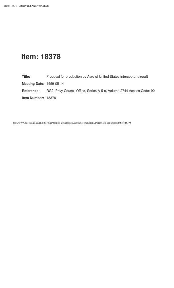 Proposal for production by Avro of United States interceptor aircraftGeneral Notes