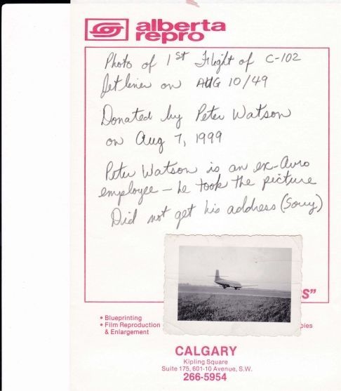 2"x 2 3/4" BW personal photo of the Jetliner taxiing for take-off. Taken by Avro employee Peter Watson.