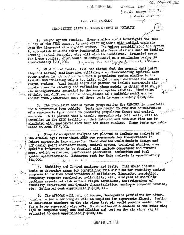 Three separate short commentaries on the potential of the Avrocar for slow, medium and supersonic missions. Pg 5 is "Some topics requiring research in support of Avrocar Development