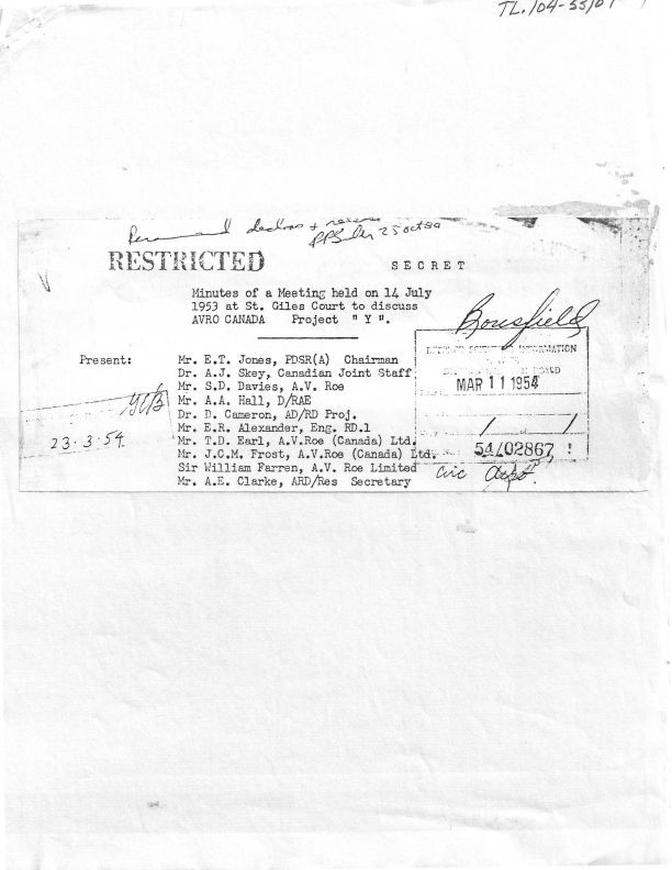 Minutes of a meeting held on 14 July 1953 at St. Giles Court to discuss Avro Canada Project "Y"