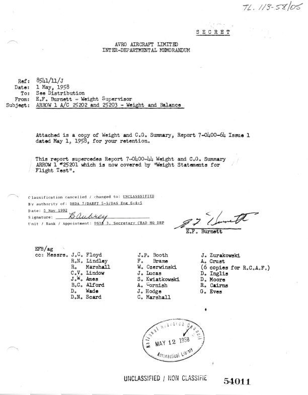 Weight and Balance Summary for Arrow Aircraft 25202 and 25203 per Issue 1; Weight and Balance for Arrow 25202 and 25203 with J75 P5 Engines, Instrument Package, Interim Radio&Radar Systems - May 1, 1958 - 7-0400-64 Issue 1. Report sent to J.C. Floyd, R.N. Lindley, R. Marshall, C.V. Lindow, J.W. Ames, B.C. Alford, D. Wade, D.N. Scard, A.R. Buley, J.P. Booth, F. Brame, W. Czerwinski, J. Lucas, S. Kwiatkowski, A. Cornish, T. J. Hodge,  C. Marshall, J. Zurakowski, A.J. Crust, D. Inglis, D. Moore, R.B. Cairns, G. Eves