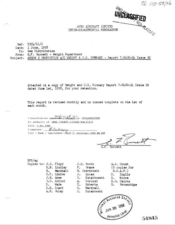 Weight and Balance Summary for Arrow 2 Aircraft per Issue 20; Weight and Balance Summary per Issue 20. Aircraft with Orenda PS13 Engines, Sparrow II Missles, Astra 1 Radar. Report sent to J.C. Floyd, R.N. Lindley, R. Marshall, C.V. Lindow, J.W. Ames, B.C. Alford, D. Wade, D.N. Scard, A.R. Buley, J.P. Booth, F. Brame, W. Czerwinski, J. Lucas, S. Kwiatkowski, A. Cornish, T. Roberts, C. Marshall, J. Zurakowski, A.J. Crust, D. Inglis, D. Moore, R.B. Cairns, D. Brownridge