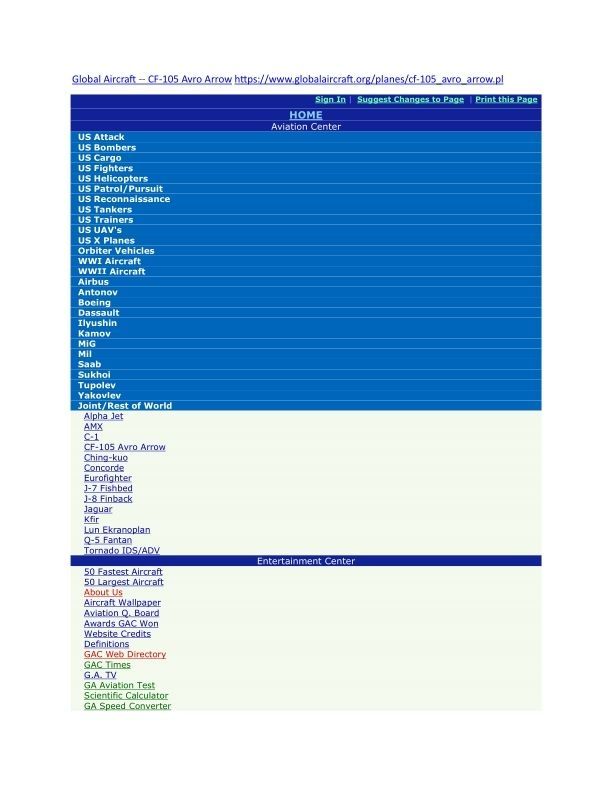 Detailed history and Specifications of CF-105 Arrow printed in 2008 from Global Aircraft website