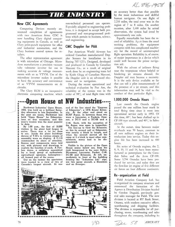 pg 70 - 1,000,000 Orenda Hours - last month the Orenda Engine passed the one million hour mark in total flying time since 1953 with 60% in the CF-100 and 40% in the SabreGeneral Notes