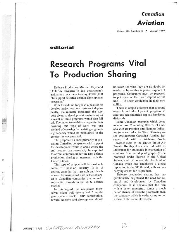 pg 19 - Research programs vital to production sharing - discusses Canada no longer in a position to develop major weapons systems independently. Also provides example of work done by Canadian Applied Research Limited (owned by Avro Canada).Publication Details