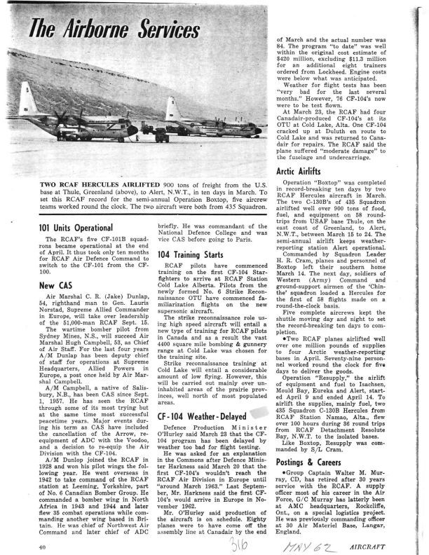 pg 40 101 Units Operational - The RCAF's five CF-101B squadrons became operational - taking only ten months for them to replace the CF-100. New CAS Air Marshal C.R. (Jake) Dunlap will take over leadership of the RCAF Sept 15th.  He replaces Air Marshal Hugh Capbell who oversaw major events including the Arrow cancellation, requipment of ADA with the Voodoo, and the decision to re-equip the Air Division with the CF-104.General Notes