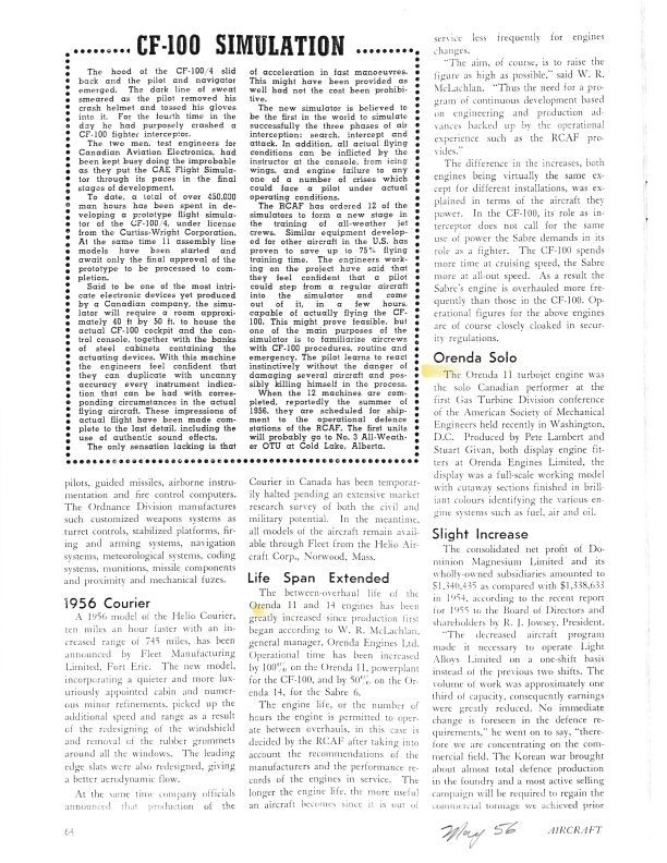 Flight Simulator developed CAE for the CF-100 and their ability to simulate engine failure, icing etc, Orenda 11 at the ASME conference, Orenda 11/14 life span extended by 100/50% respectively - pg. 64. Names include Stuart Givan, Pete Lambert, Walter R. McLachlanGeneral Notes