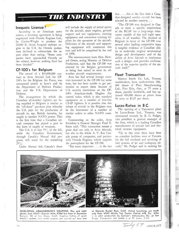 pg 78 - Iroquois License? - Curtiss-Wright to produce the Iroquois. CF-100s for Belgium. pg. 82, 85 - Engineering Plan - College program announced. pg. 88 - Layoff at Orenda / Avro Layoff - Orenda loses 350 /  500 Avro workers gone according to statement from Walter R. McLachlan, Iroquois mentioned. Names include Hon. Howard Green, acting Minister of Defence Production, Fred T. SmyeGeneral Notes