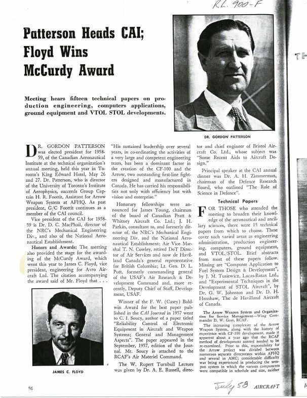 pg 56, 59 Jim Floyd receives McCurdy award, RCAF method of development control need re-examination, Papers by various Orenda and Avro employees summarized including "The Arrow Weapon Systemand Organization for Service Management" by Wing Commander D.W. Goss, RCAF talks about the complexity of the Arrow Weapon System along with the history of the CF-100 development. Some Applications of Parkinson's Law by S.L. Britton, Orenda Engines Ltd. Tooling Approach to the Avro Arrow Aircraft by E.B. Bragg, Avro Aircraft Ltd. Applications of a Large-Scale digital Computer in aircraft design and development by A.O. Downing, Avro Aircraft Ltd.General Notes