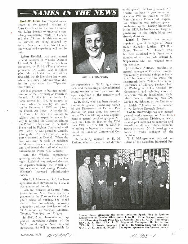 pg 53 - Fred W. Luker resigns as assistant to the general manager of Avro Canada's Gas Turbines Division - he intends to undetake consulting engineering work in Canda and the US and his services are being retained so that Orenda knowledge and experience are not lost.  Earl K. Brownridge named General Works Manager of Avro Canada's Gas Turbine DivisionGeneral Notes