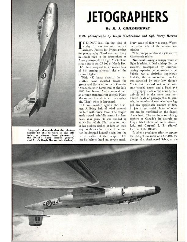 Experieces of photographing from the CF-100 described with photos of Hugh Mackechnie and Cpl. Barry Herron. Images include CF-100 FB-S, 18148, 18473 and one starting with 1853x plus photos of the jetographersPublication Details