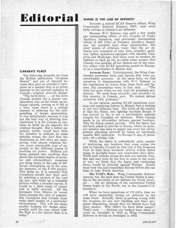 Pg 50 Where is teh line of Defence? - Remarks from a British Publication "Aviation Report" which are of interest as they provide an outsider's viewpoint on a subject that is of prime interest to the aircraft industry in Canada - original aircraft design. Also, published are comments form a retired RCAF Rerserve officer, Wing Commander Richard Rohmer DFC, "Where is the LIne of Defence?" who took some swings at Canada's air defences, wherein he laments the lack of aircraft capable of defending against Russian bombers coming across the pole to Canada.General Notes