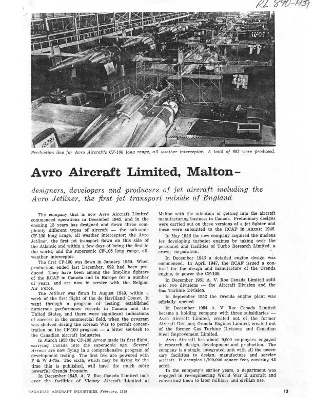 pg 13 Key dates of Company: opened Dec 46, CF-100 first flight Jan 50, Jetliner first flight Aug 49, Turbo acquired Mar 46, Aircraft and Engine Divisions formed Dec 51, AVRoe became holdco Dec 54, Arrow first flight Mar 58Publication Details