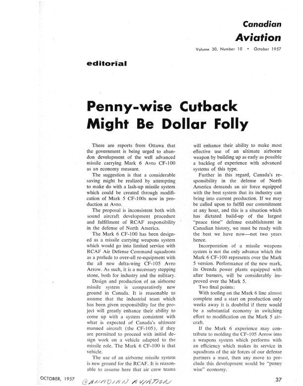 pg 37 editorial about the cancelling of the CF-100 Mk 6