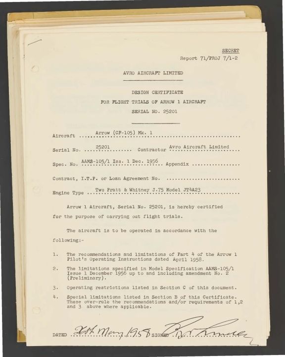 Design Certificate for Flight Trials of Arrow 1 Aircraft 25201