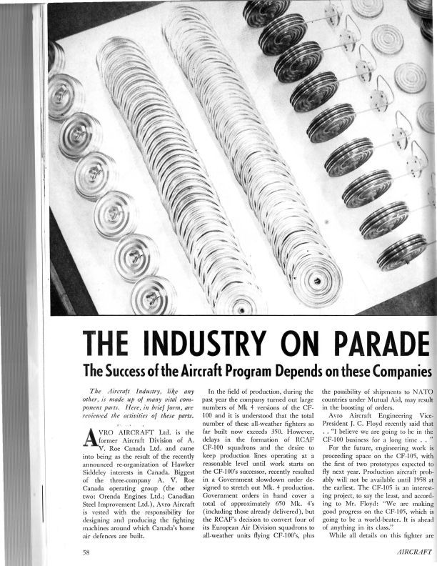 pg 58-89, 117-118 - A story about various current aircraft companies  including Avro Aircraft Limited, Canadian Car & Foundry, Orenda Engines includes CF-100 and CF-105. pg 69 - Canadian Steel Improvement - Steel subsidiary story. pg 72 Jarry Hydraulics - An article describing Jarry's evolution into Aircraft design work and announcement that it will be designing the front landing gear for the Arrow. pg 75 Winnepeg firm to convert 50 CF-100 Mk 3 to dual control trainers. pg 79 - Image of blades. pg 80 Chatco Steel builds various pieces of the CF-100 Mk 4Publication Details