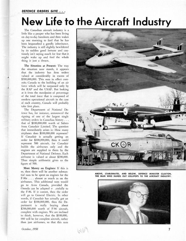 pg 7-9 highlighing investment in aircraft industry with details on Avro and Orenda plus image of CF-100 18101 and photo of Defence Minister ClaxtonPublication Details