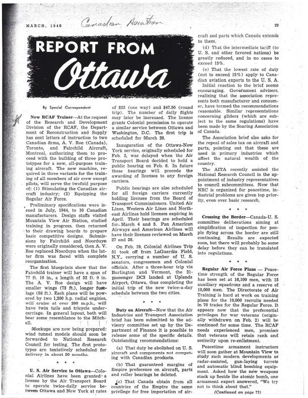 pg 29 New RCAF Trainer - discusses A.V. Roe (Canada) being sent authorization to build prototypes for a new, all-purpose traning aircraftPublication Details