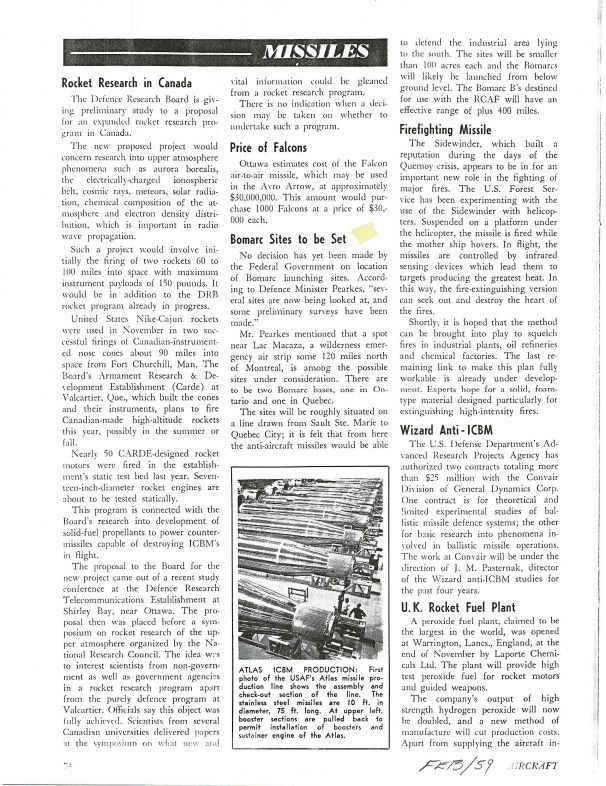 From Aircraft 1959 Feb pg 74 - Price of Falcons - Falcon missile which may be used on the Arrow priced at $30000 ea. Bomarc Sites to be set - Bomarc sites still undefinedGeneral Notes