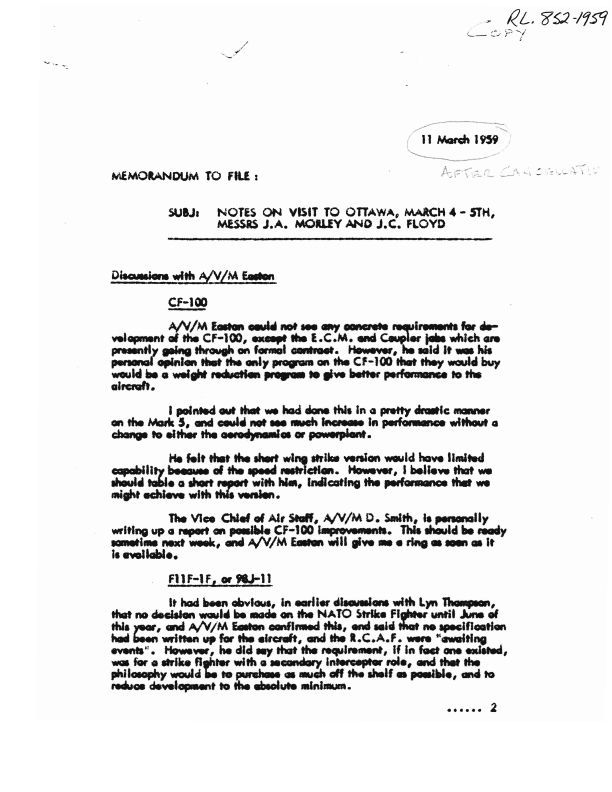 Note to File prepared by J.C. Floyd following meeting with Air Vice Marshall Easton in Ottawa with J.L. Plant, discussion future plans for Canuck, trainers, Jet transportEntry/Object ID