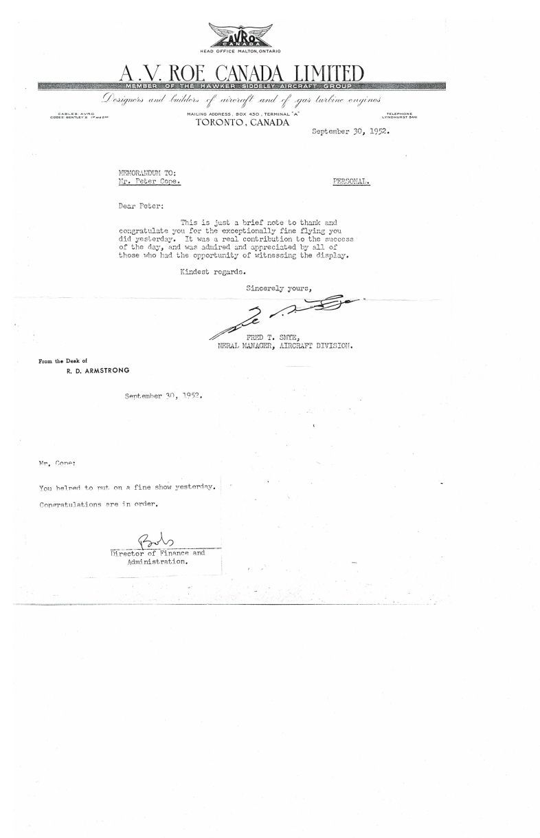 Date / Time Period: 9/30/52 Pages: 1 Author: Fred T. Smye, R.D. Armstrong Publisher: A.V. Roe Canada Limited