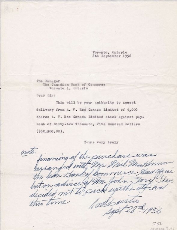 Letter gives bank authority to receive Avro shares for Curtis' personal account. Handwritten note states thet Curtis subsequently declined to accept the stock. Sept 6, 1956