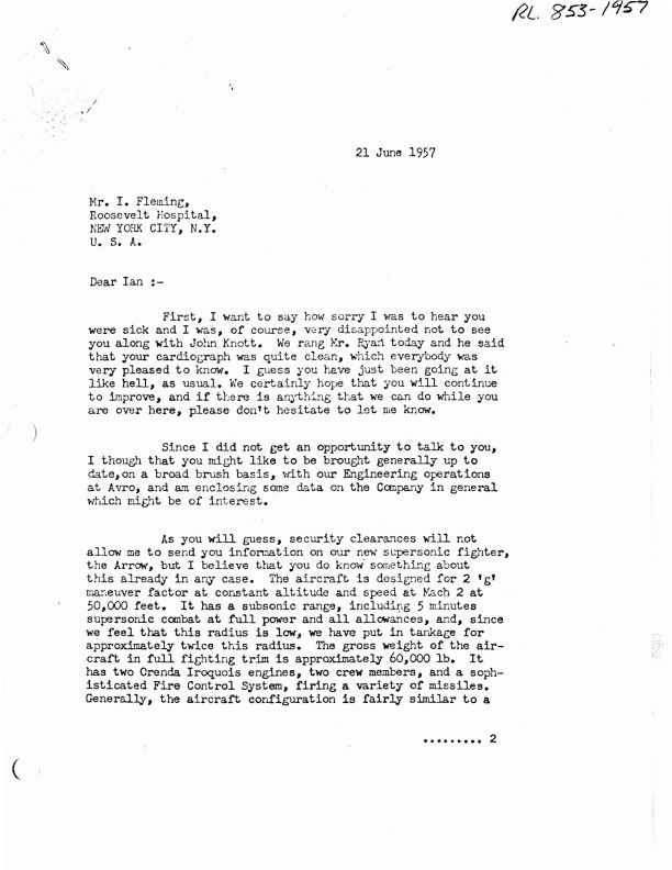 Letter J.C. Floyd to I. Fleming discussing Arrow specs, comments on the days of manned fighter "are obviosly numbered" and referencing an old photo of the technical office at Chadderton where I. Flemming and Tommy Thomson were included.Entry/Object ID