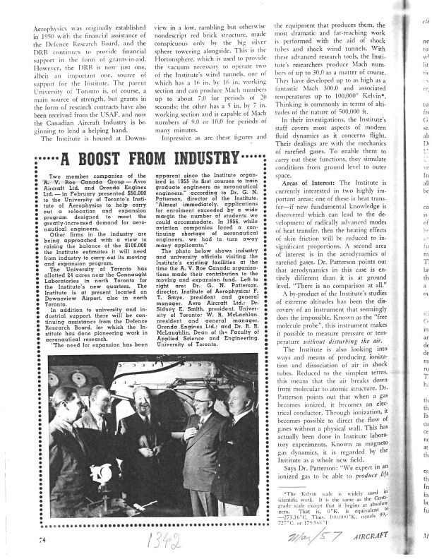 Page 74-A photo of executives and a description of donations from AV Roe and Orenda to U of T for an expansion of aeronautical engineers training.General Notes