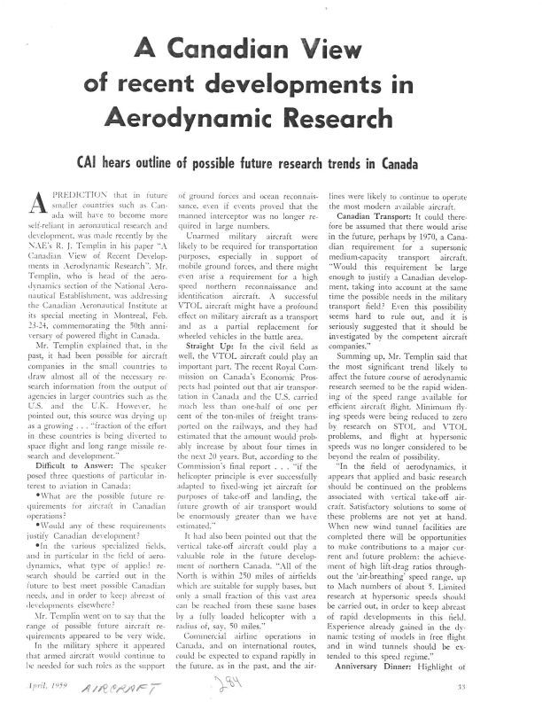 A Canadian View of recent developments in Aerodynamic ResearchEntry/Object ID
