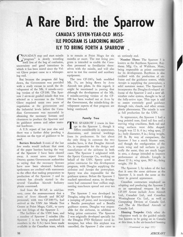 pg 88, 122 Article about the Sparrow 2 missile system being acquired by the Government after the termination of the Velvet Glove project describes Avro Aircraft Ltd.'s involvement including the development of the CF-100/6 Canuck missile-carrying test aircraft and the use of two CF-100/5's for test firings. The Sparrow 2 was intended to be the operational weapon for the CF-105 Arrow.General Notes