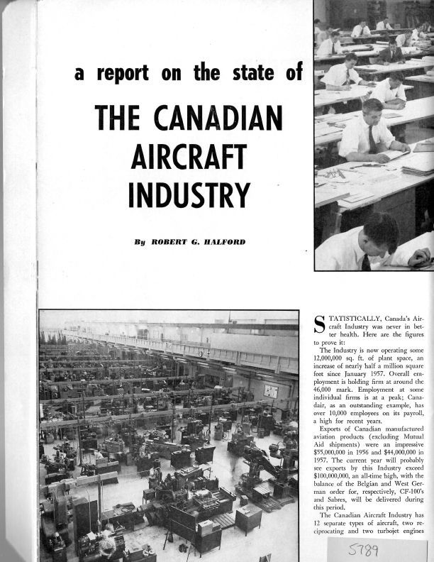 Pg 16, 17, 19, 22, 24, 26, 28, 32, 35, 36-50,65, 68,71,72,74,77,78,68,80,119-122, Overview report on the state of Canada's aircraft industry that includes references to the CF-100 (with details of the Belgian CF-100 order and USA/Canada covering the costs), Orenda Engines Ltd. production and exporting, Avro Aircraft Ltd. and the Arrow, the Canaian Car Company's (Can-Car) aircraft division, Canadian Applied Research (CARL), and Canadian Steel Improvement Ltd. The article includes photographs of the Orenda turbojet, the Arrow, Arrow ground support equipment, the Arrow landing gear, some Can-Car overhaul and assembly operations, the Arrow test model being prepared for launch, the Orenda test facility and equipment. Story includes all other key Canadian aviation companies.Publication Details
