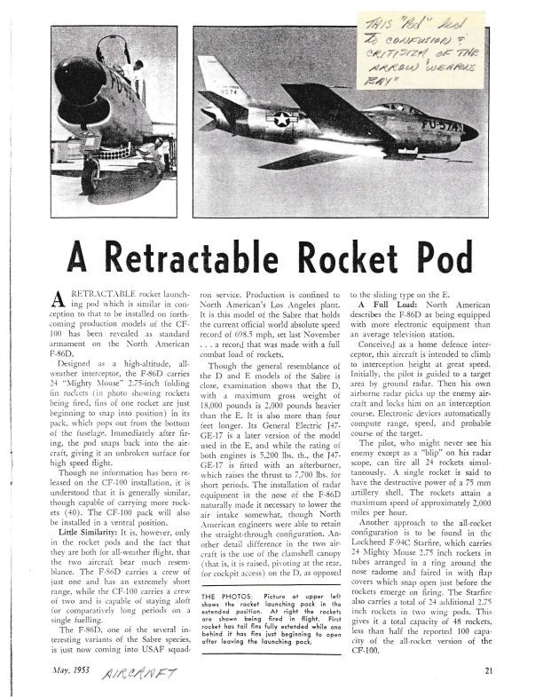 Pg 21 - The F-86 Sabre has retractable rocket pods, but can carry less than half of what the CF-100 can. A weapons pod that is carried inboard when not in use to streamline fuselageGeneral Notes