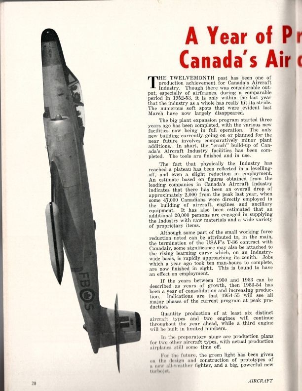 Pgs 20-32 (not complete) - News item - CF-100/4 - This latest version of the Cf-100 powered by series 9 Orenda engines is being quantity produced by AVRO Canada at the rate of about 1 per day. About 600 Mk.4's are on order. - CF-105 - The Government has ordered the design and construction of a prototype of a big all weather delta fighter to be successor to the the CF-100. - Orenda- Over 1,000 Orendas have now been delivered with the series 9 and 10 each being rated at 6,500 pounds being the models in production. Series 11 at 7.500 pounds has been developed and work continues on higher powered versions. - "Waconda" seens to be the commonly known name for the existance of a new turbjet design undertaken by Avro Canada (Iroquois). Industry reports indicate it is in the design stage and that a prototype will be running within a year. Design engineers are aiming at a thrust of 18-20,000 pounds. - The newest design project at Avro is the CF-105 successor to the CF-100 by 1958-59, will utilise a delta wing design, target speed is 1,200 mph, design weight at 68,000 pounds and range of 1,500 miles. pg 26 has "Fighter of the Future" with a short article about the design of the CF-105. At the time Avro Canada was given the go-ahead on CF-105 no engine choice has been made. "Place in the Sun" - The respect with which Avro Canada is regarded by the parent Hawker Siddeley Group when it selected Avro Canada as the location of the Group's Design Council.General Notes