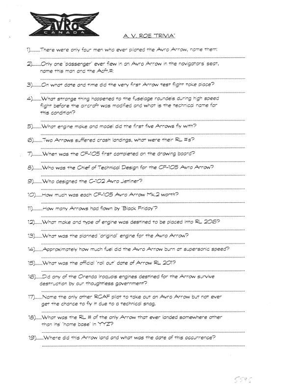 A 4-page list of trivia questions about Avro, apparently prepared by the Museum for promotional purposes.