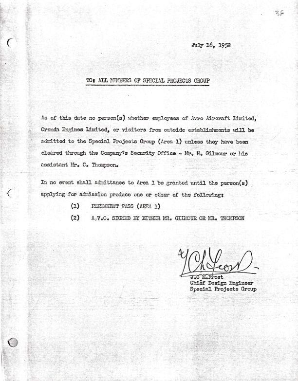 Memo outlining access and restriction for Area 1. Names include John Carver Meadows Frost, Hugh C. Gilmour, C. Thompson.