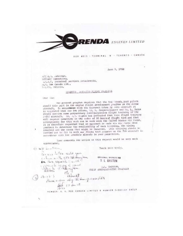 Orenda requests that 2 pilots be provided flight training. M. Cooper-Smith and L. Hobbs should fly the F-102 for training on the Arrow Mk 2General Notes