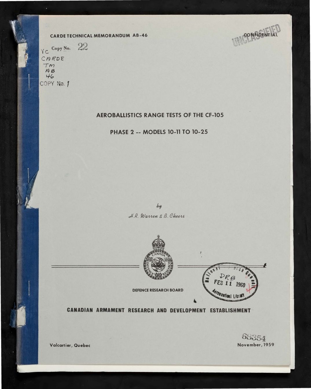 Date / Time Period: 1959-Nov Pages: 41 Author: Warren, H. R., Cheers, B. Publisher: Canadian Armament Research and Development Establishment