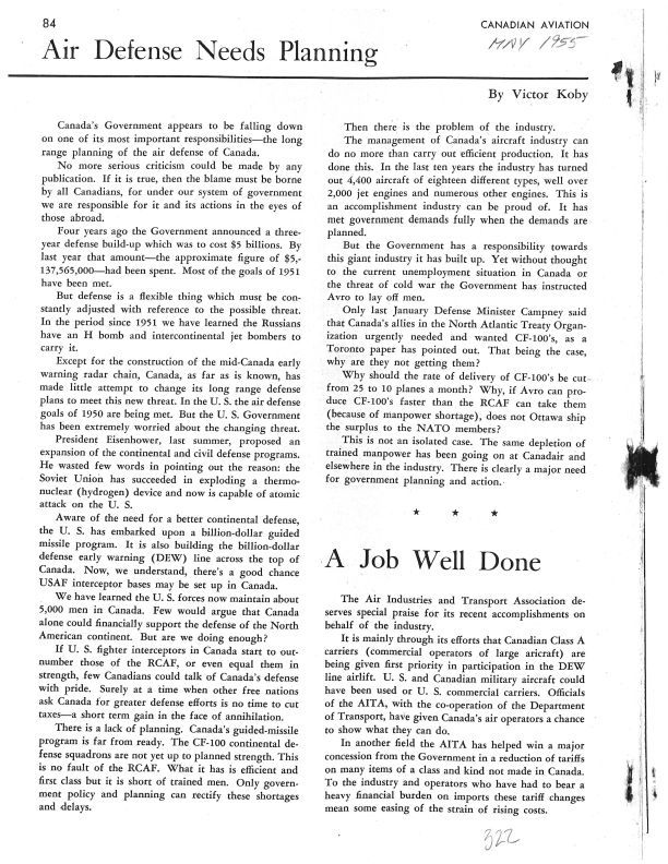 pg 84 - discusses need for long range planning for the air defenec of Canada. Story highlights that CF-100 squadrons are not up to planned strength yet.Publication Details
