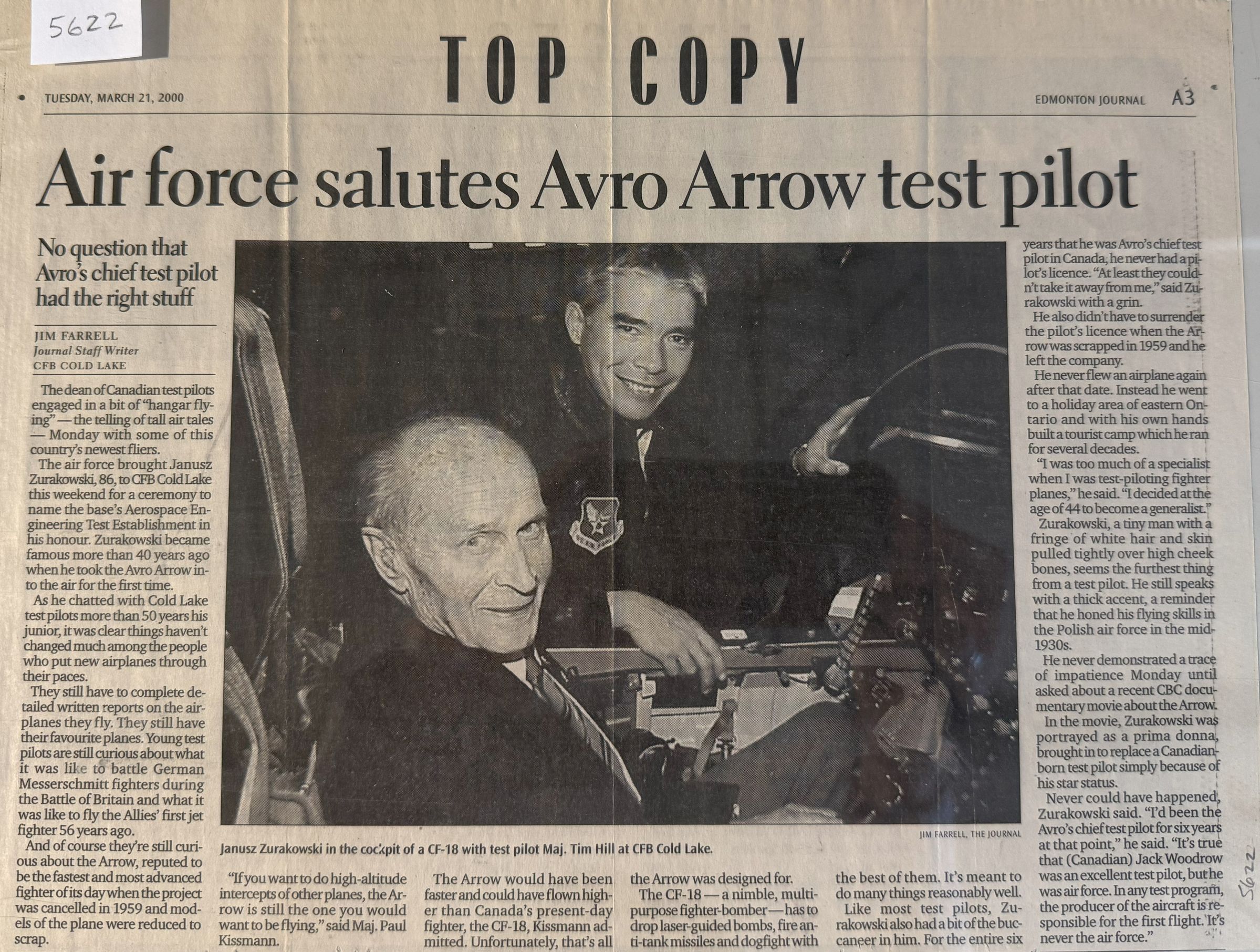 Newspaper article about naming a building at Cold Lake Aerospace Engineering Test Establishment in honour of Jan Zurakowski. Jack Woodrow listedPublication Details