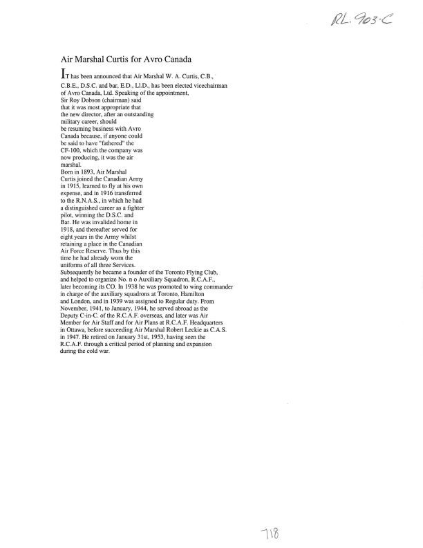 mini-bio about Air Marshal Curtis after being elected Vice-Chairman of Avro Canada Limited - based on Sir Roy Dobson's comments