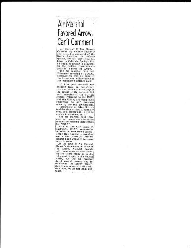 Air Marshall C. Roy Slemon, No 2 man at NORAD stated the Arrow was Indispensable, but also that NORAD is completely responsive to whatever the governments decideGeneral Notes