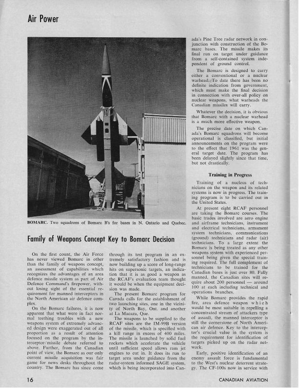 Pgs 16-17 - Family of Weapons Concept Key to Bomarc Decision - Update on the Bomarc program, it is meeting expectations using the IM-99B version. Discusses SAGE and CF-100.Publication Details