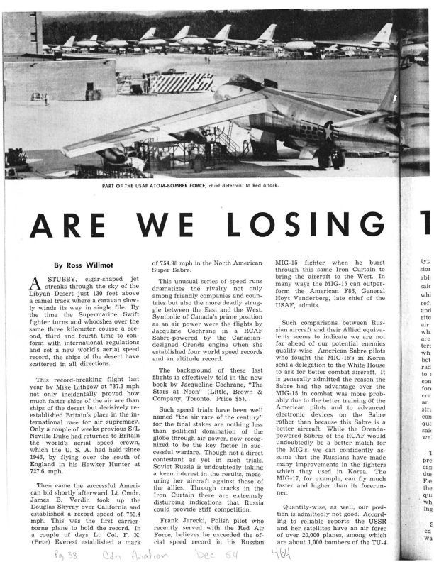 pg 38, 39, 89, 92, 94, 96 Includes ad "Heading for Ceiling in Safety" showing FB-S - Micro Switch a Honeywell company. Story covers Orenda powered Sabre V, A.V. Roe Canaada production on the rocket firing CF-100 Mark IV.Publication Details