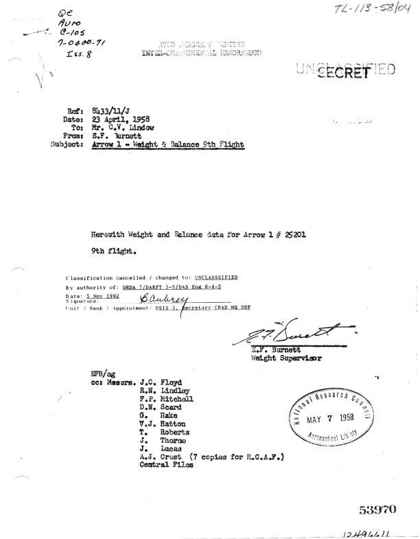 Weight and Balance Data for 9th Flight of Arrow 1-25201 7-0400-71 Issue 8. Names include C.V. Lindow, E.F. Burnett, J.C. Floyd, R.N. Lindley, F.P. Mitchell, D.N. Scard, G. Hake, V.J. Hatton, T. Roberts, J. Thorne, J. Lucas, A.J. Crust.