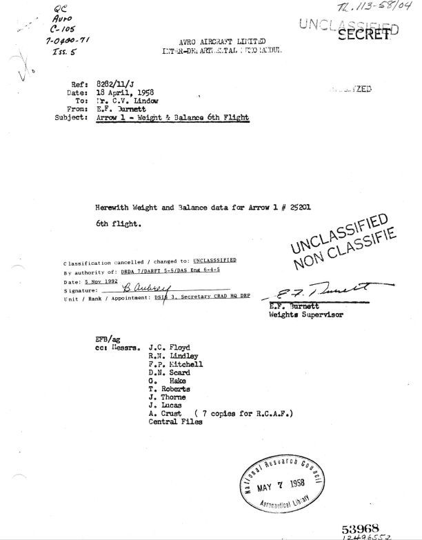 Arrow 1 - Weight and Balance Data - 6th Flight for Aircraft 25201