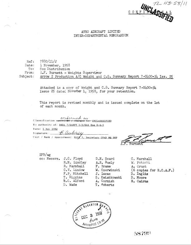 Weight and Balance Calculations for Arrow2 with PS 13 Engines, Genie Missles Hughes Electronics. Names include E. F. Burnett, B. Aubrey, J. C. Floyd, R. N. Lindley, R. Marshall, C. V. Lindow, F. P. Mitchell, T. Higgins, B. C. Alford, D. Wade, D.N. Scard, A. R. Bueley, F. Brame, W. Czerwinski, J. Lucas, S. Kwiatkowski, A. Cornish, T. Roberts, C. Marshall, W. Potochi, A. Crust, D. Inglis, D. Moore, R. Cairns
