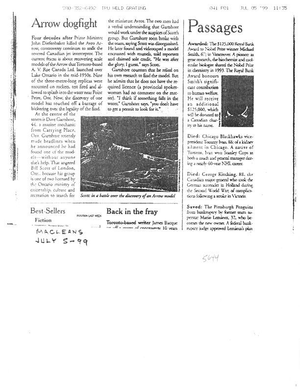 Brief magazine article describing the disagreement between rivals searching for the Arrow models in Lake Ontario.