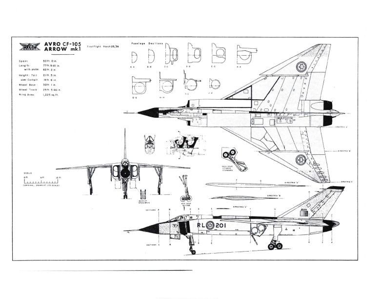 A sketch showing dimensions and cross sections of the Arrow